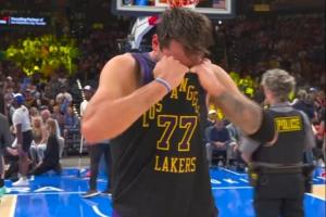 GIF-东契奇受伤倒地捂着后侧大腿